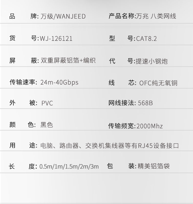 品 牌:萬(wàn)級(jí)/WANJEED 產(chǎn)品名稱(chēng)萬(wàn)兆八類(lèi)網(wǎng)線